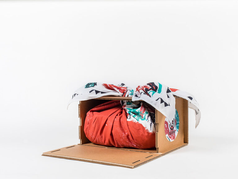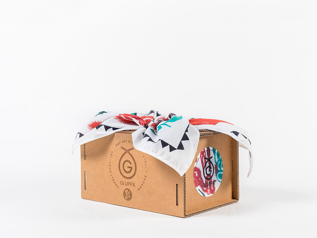 There Gluppa di Terra is a food box that contains an artist's fabric and a selection of products from the Marche peasant tradition.