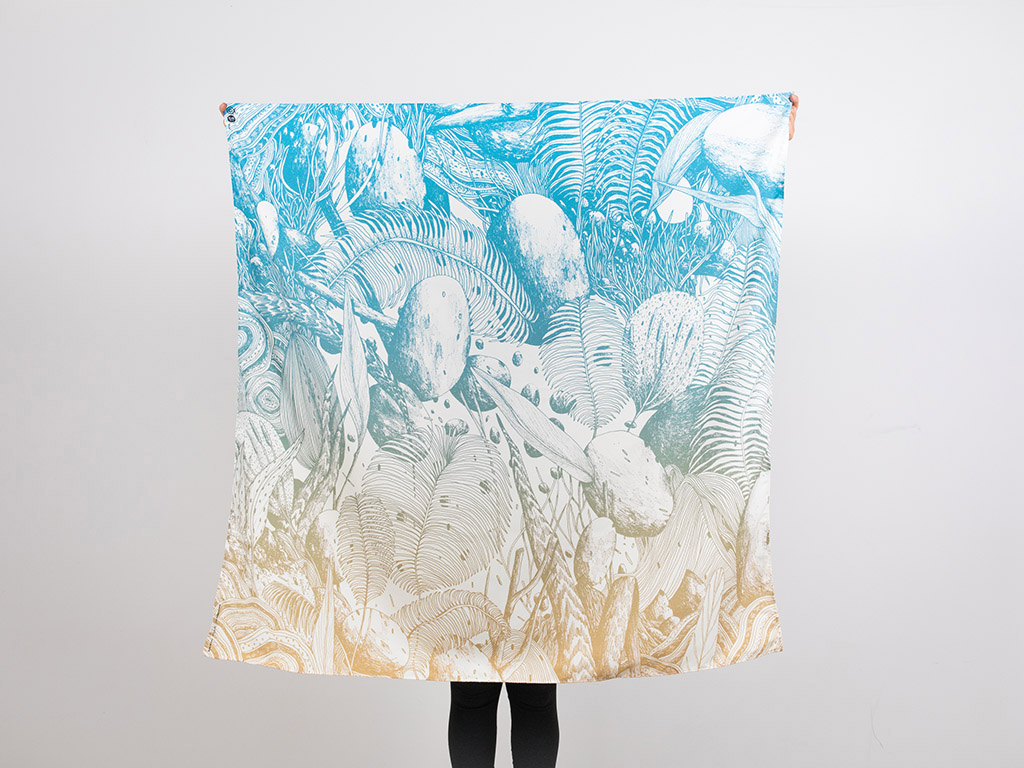 Tessuto d’artista by Tellas ritrae sassi, piante del sottobosco, elementi del paesaggio naturale, tratti distintivi che caratterizzano tutti i lavori dell’artista.